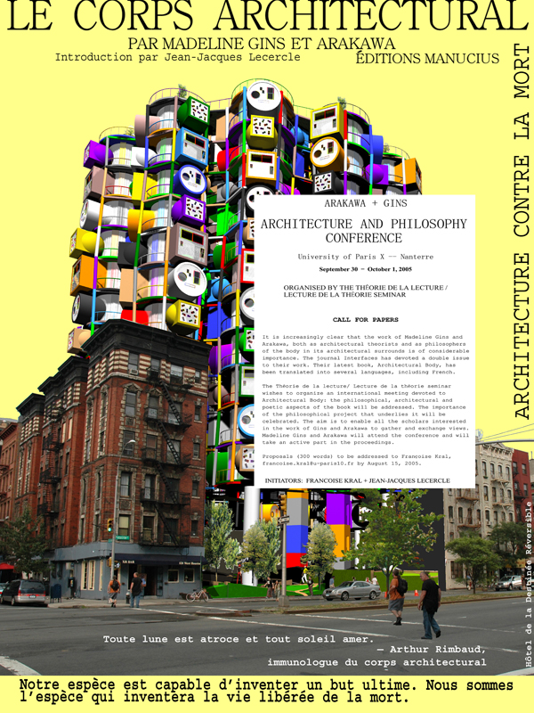 The Théorie de la lecture/ Lecture de la théorie seminar organized an international meeting devoted to Architectural Body where the philosophical, architectural and poetic aspects of the book are envisaged. The importance of the philosophical project that underlies it are celebrated, with the aim to enable all scholars interested in the work of Gins and Arakawa to gather and exchange views.
