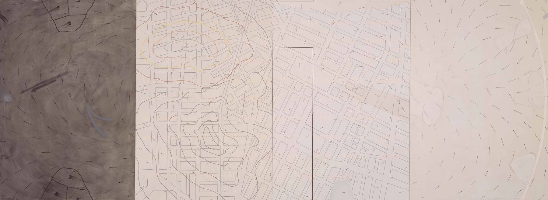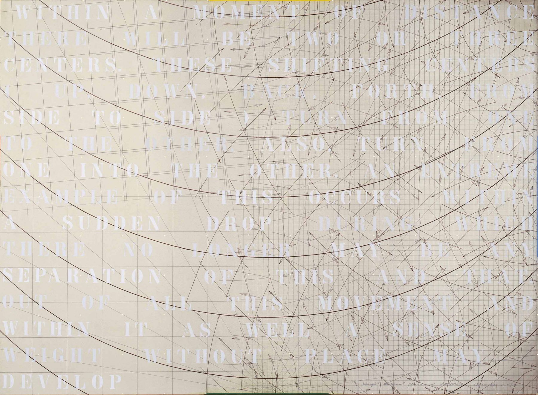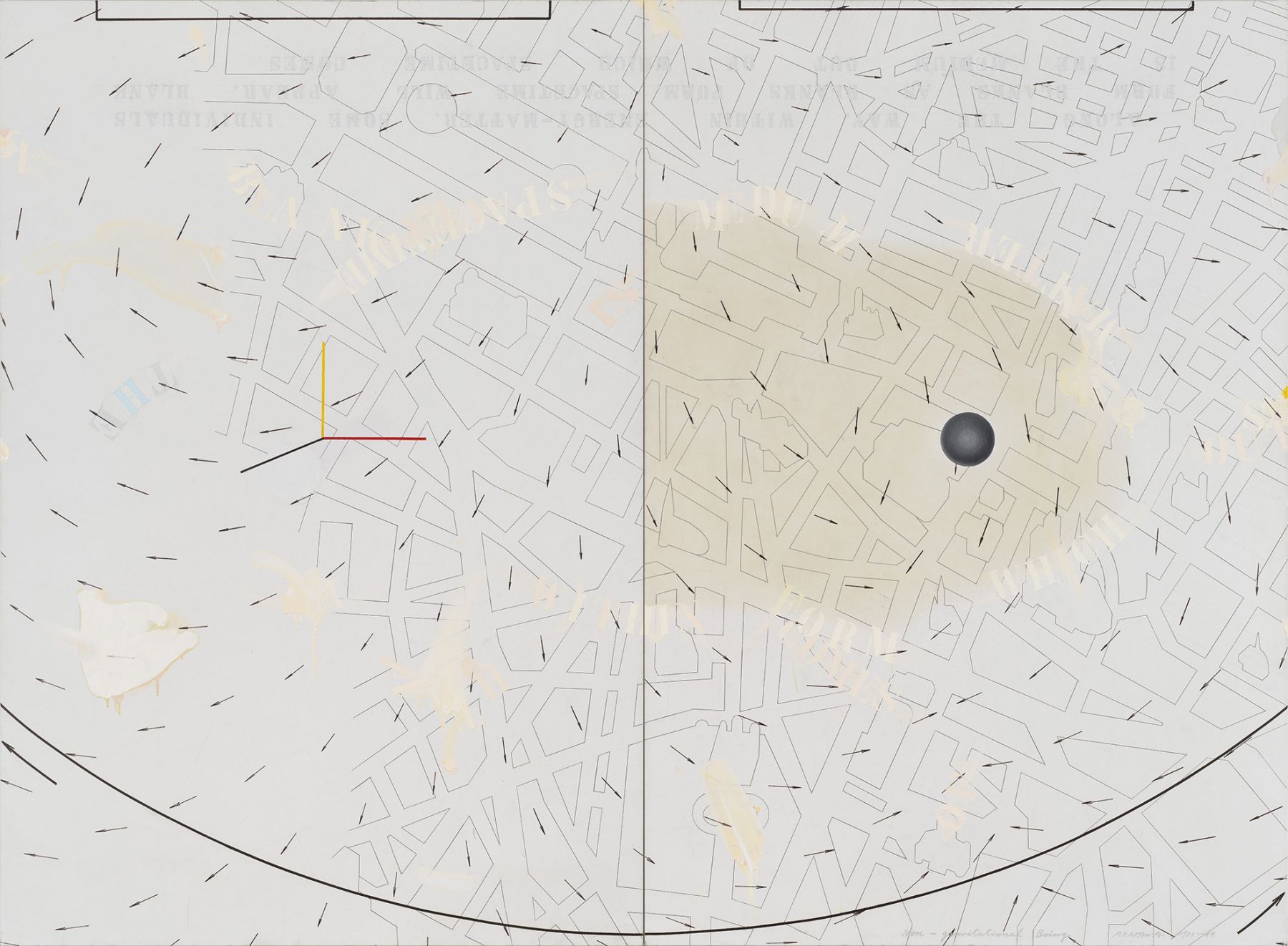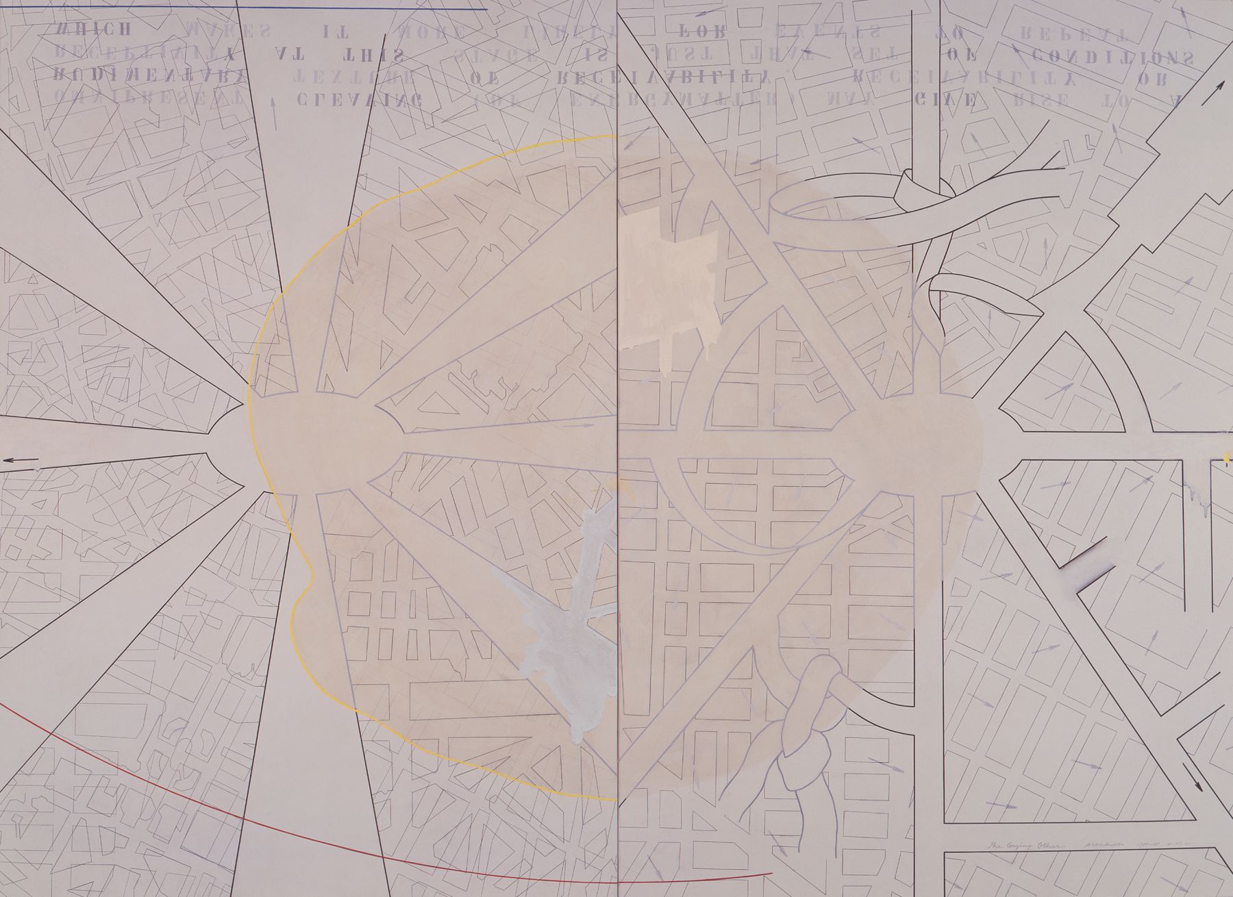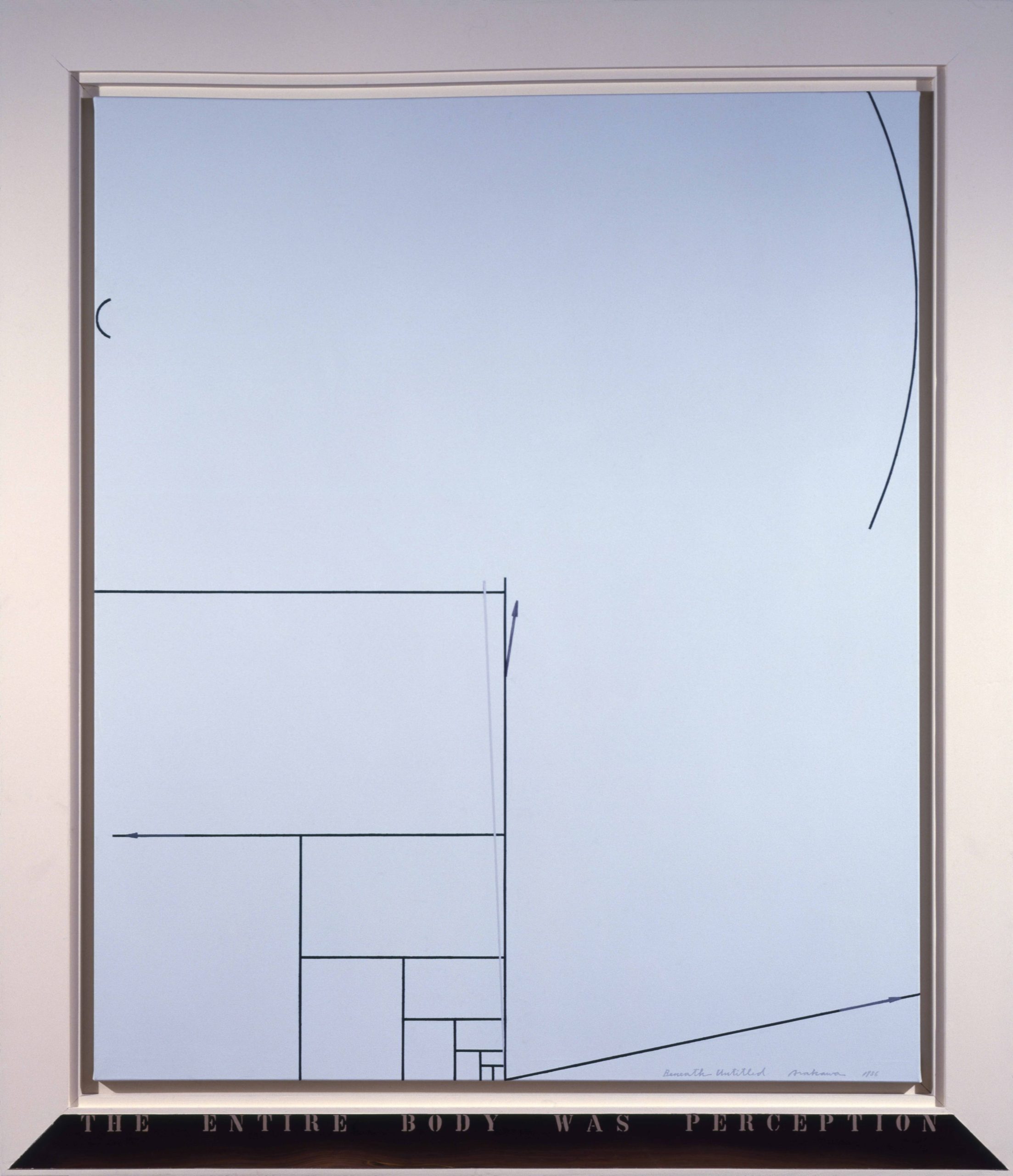 Throughout the 1980s, Arakawa continued to address both the physical and conceptual relationship of the viewer to a painting. Just as the paintings had become physically expansive towards the end of the 1970s, the works now became monumental, at times almost reaching twelve feet high and often three or four panels wide; across the surface of these massive canvases, he used directional arrows reminiscent of wind currents twisted over street maps and texts. Shifting in scale to smaller-sized paintings in the mid-1980s, Arakawa introduced a heavy white frame to emphasize a surface that incorporated marks for measuring and containing, and inverted text (partially obscured by layers of paint), to further focusing on the act of perceiving. Later in the decade, Arakawa re-engaged with the physical body by introducing photographic floor panels as part of the work, which the viewer was invited to stand upon in order to view large-scale multi-paneled canvases. In this group of works, as part of his retrospective in Japan, were two room-sized installations of paintings with sloping moving walkways that required the viewer to be in continual motion.