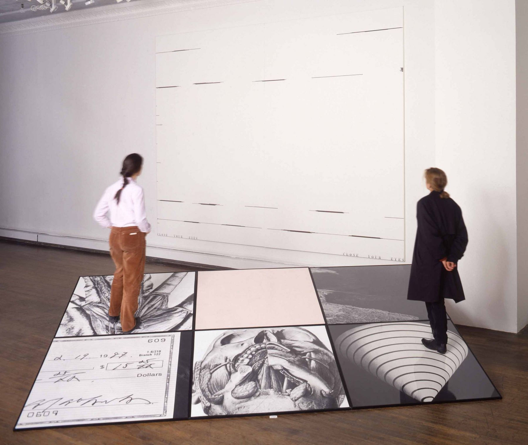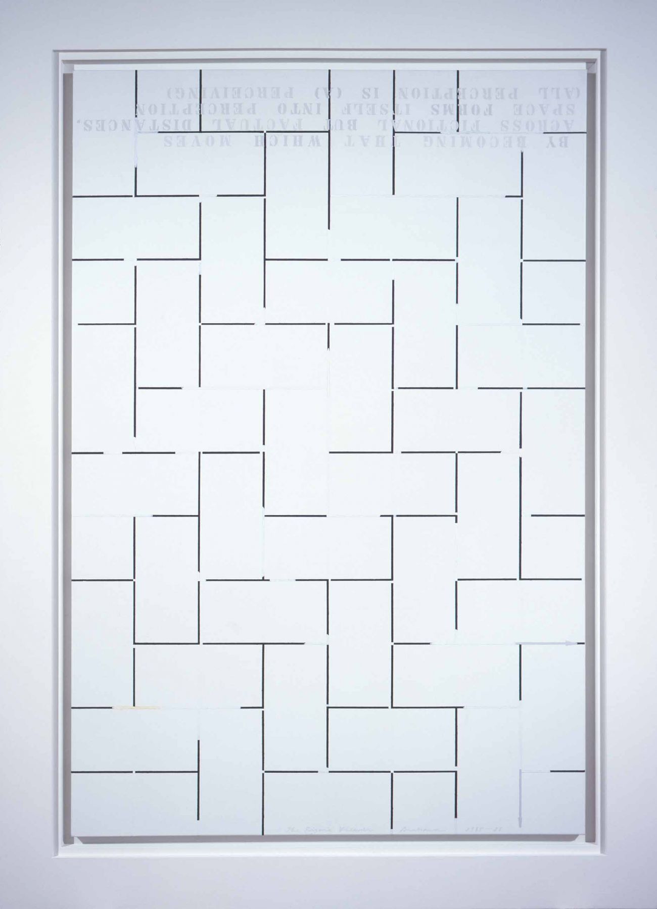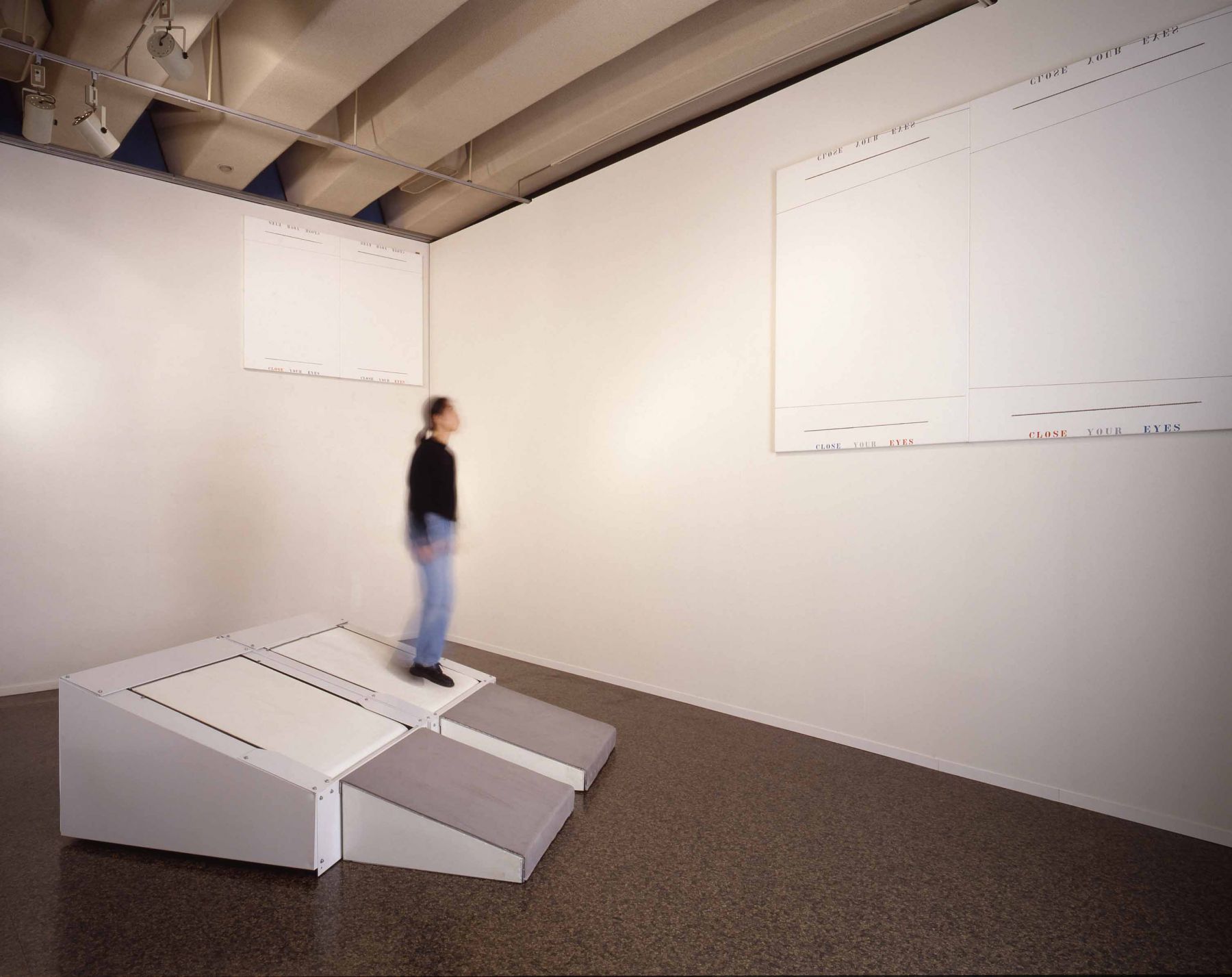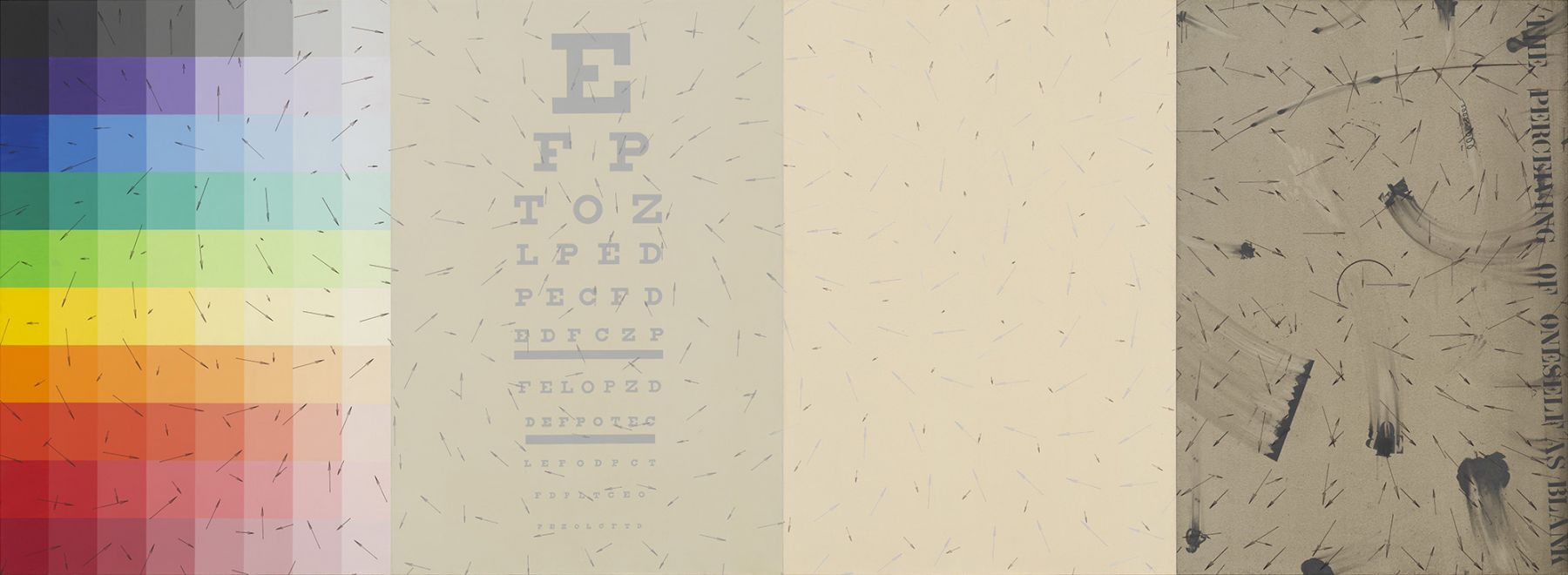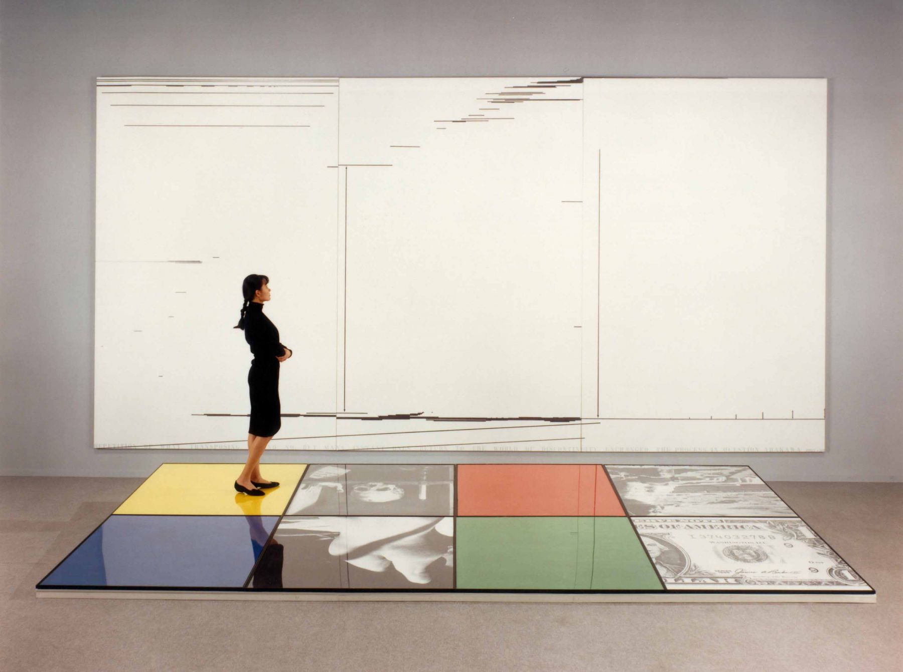 Throughout the 1980s, Arakawa continued to address both the physical and conceptual relationship of the viewer to a painting. Just as the paintings had become physically expansive towards the end of the 1970s, the works now became monumental, at times almost reaching twelve feet high and often three or four panels wide; across the surface of these massive canvases, he used directional arrows reminiscent of wind currents twisted over street maps and texts. Shifting in scale to smaller-sized paintings in the mid-1980s, Arakawa introduced a heavy white frame to emphasize a surface that incorporated marks for measuring and containing, and inverted text (partially obscured by layers of paint), to further focusing on the act of perceiving. Later in the decade, Arakawa re-engaged with the physical body by introducing photographic floor panels as part of the work, which the viewer was invited to stand upon in order to view large-scale multi-paneled canvases. In this group of works, as part of his retrospective in Japan, were two room-sized installations of paintings with sloping moving walkways that required the viewer to be in continual motion.